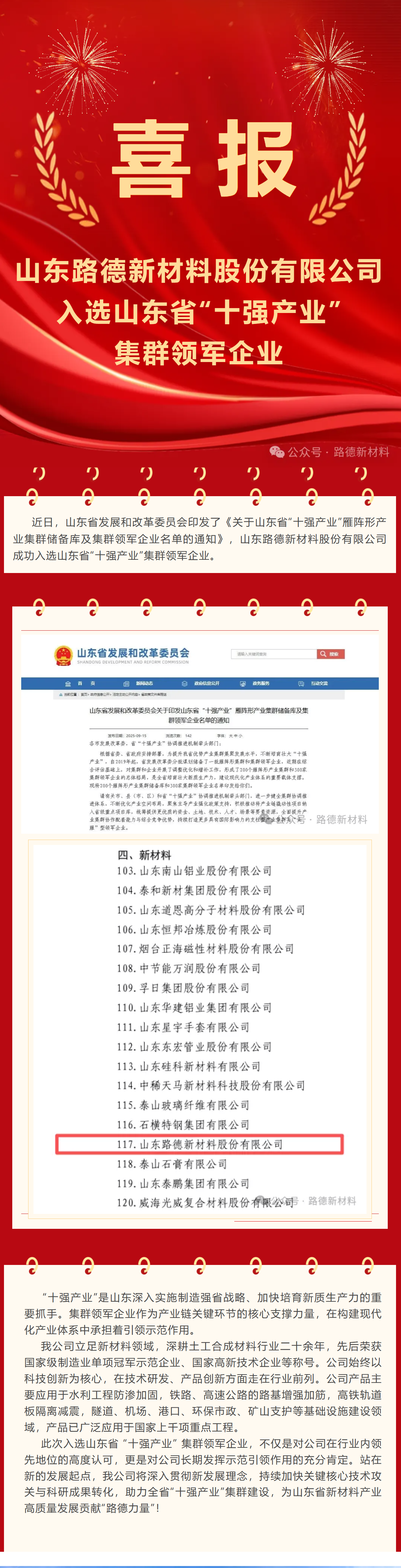 喜报!山东路德新材料股份有限公司入选山东省“十强产业”集群领军企业